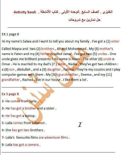 حل الوحدة الاولي كتاب الانشطة Activity Book لغة انجليزية للصف السابع الفصل الاول